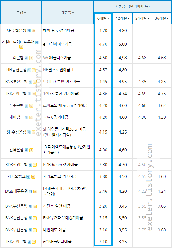 가입기간 6개월 기준으로 수협은행 헤이정기예금이 4.70%의 최고 금리를 보이고,