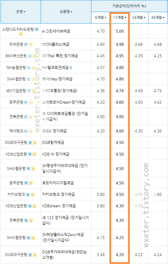 아래는 높은 예금금리 순서로(단리, 12개월 기준) 정렬한 금리표 입니다.
