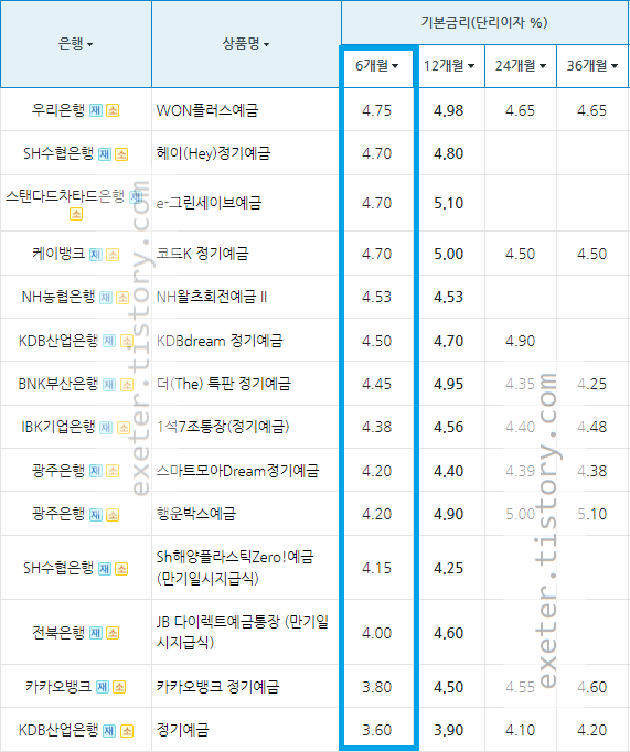 아래는 6개월 예금금리 기준, 높은 금리 순서로 정렬한 자료입니다.