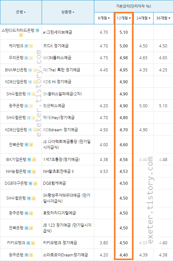 작성일 2022년 12월 3일 기준, 정기예금 기본 금리가 높은 순서로 상위 10개는 아래와 같습니다.