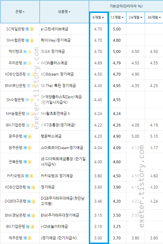 가입기간 6개월 기준으로 SC제일은행 e-그린세이브예금이 4.70%의 가장 높은 금리를 보이고 있으며