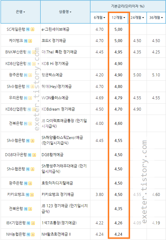 1년 기준, SC제일은행 e그린세이브 예금 상품이 가장 높은 금리(5.0 %)를 제공하고 있습니다.