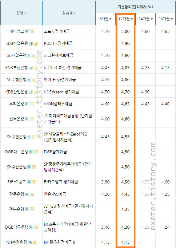아래는 높은 예금금리 순서로(단리, 12개월 기준) 정렬한 금리 표입니다.