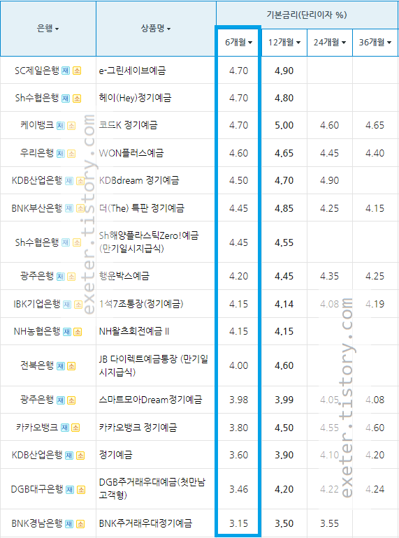 가입기간 6개월 기준으로 SC제일은행 e-그린세이브예금이 4.70%의 가장 높은 금리를 보이고 있으며
