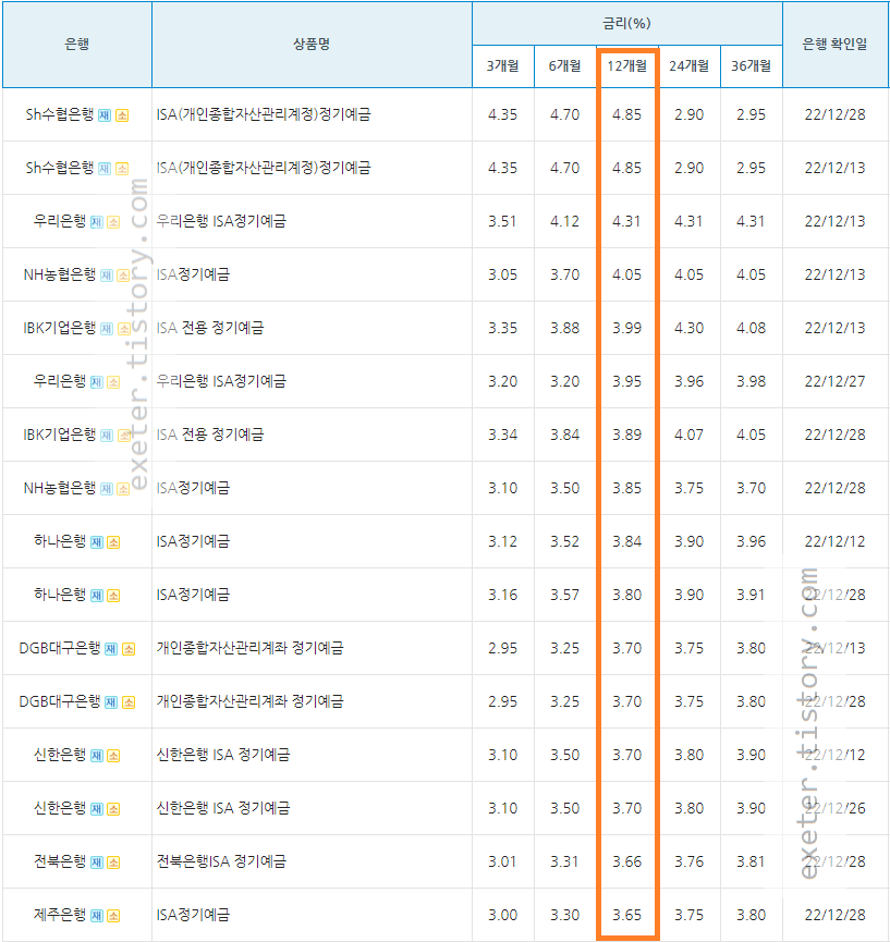 ISA 예금 은행금리 - 1년(12개월) 기준 / 높은 순서 정렬 (중복 은행 제외)