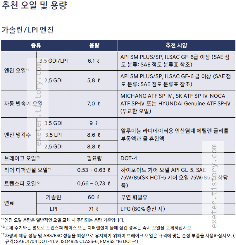 - 엔진 오일*1 (3.5 GDI/LPI): 6.1 리터 (API SM PLUS/SP, ILSAC GF-6급 이상