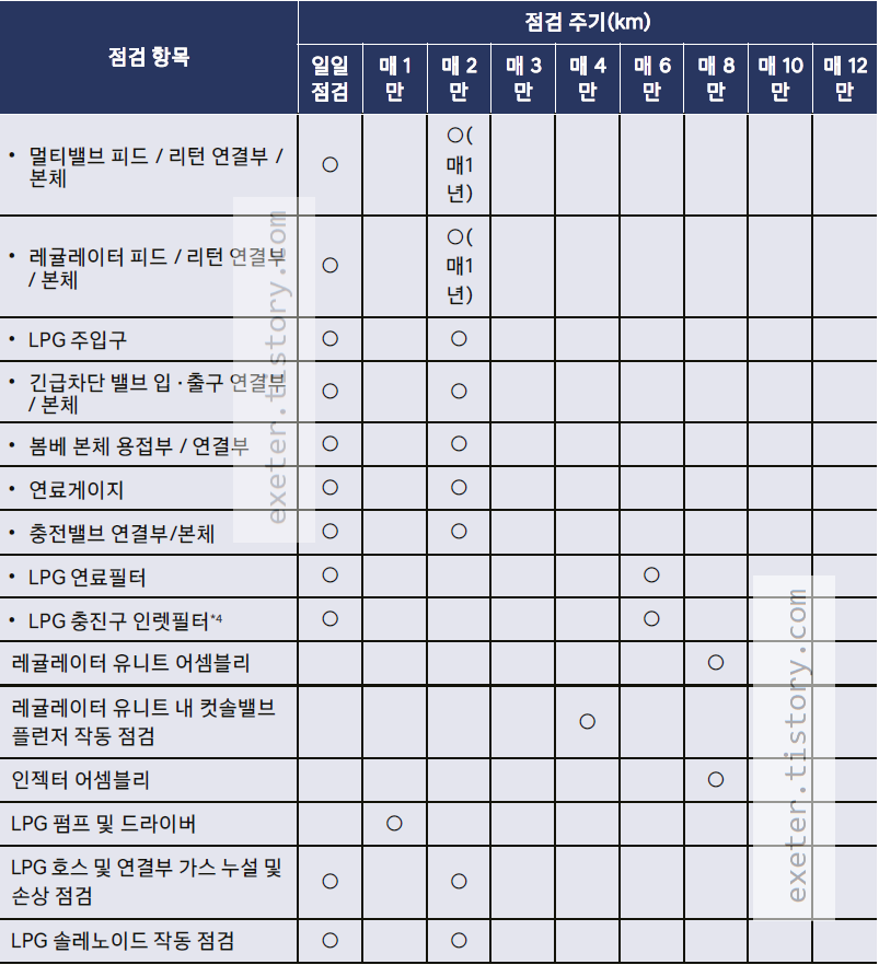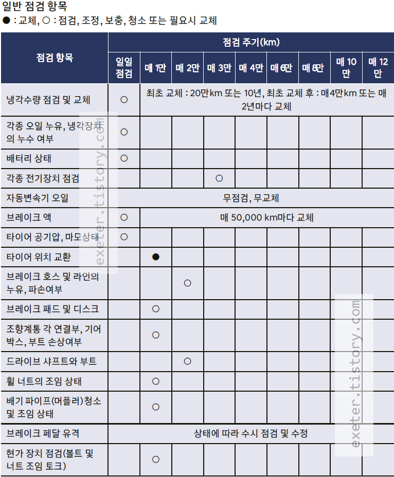 - 냉각수량 점검 및 교체: 최초 교체 : 20만km 또는 10년, 최초 교체 후 : 매4만km 또는 매2년 마다 교체