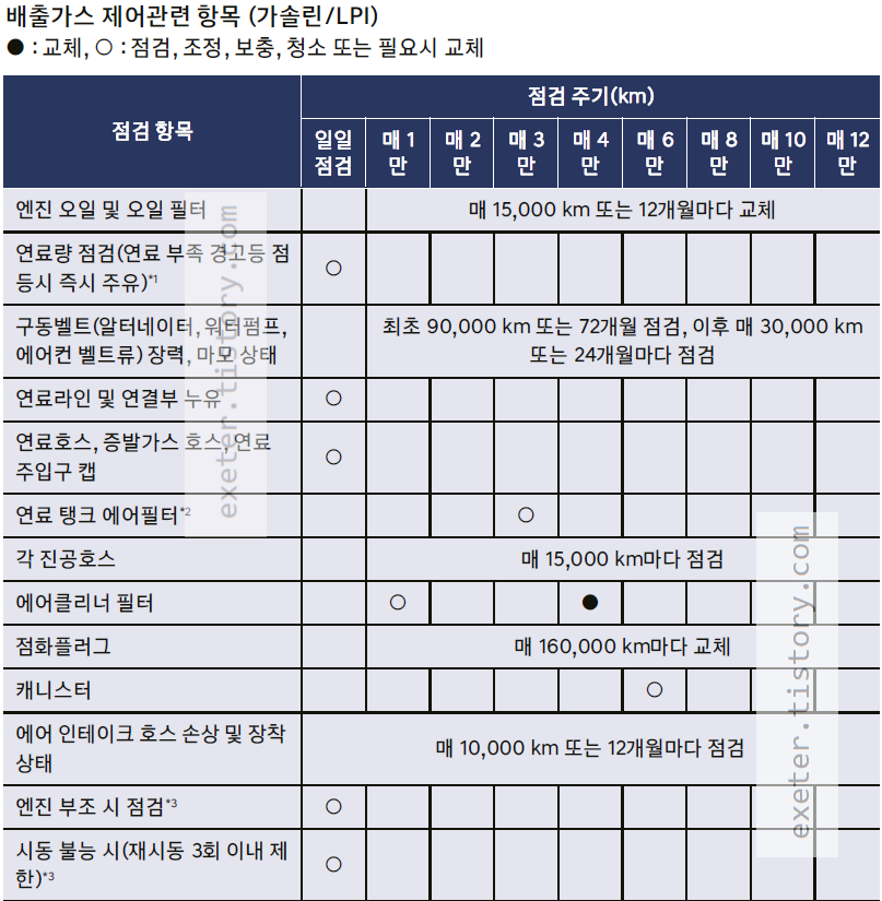 - 에어클리너 필터 점검/교환: 매 1만 km 점검, 4만 km 교환