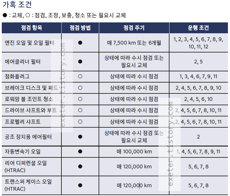 이러한 가혹 조건인 경우에는 엔진 오일은 '매 7500Km 또는 6개월'마다 교체로 안내하고 있습니다.