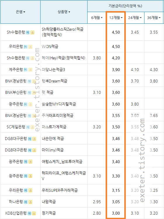 아래는 시중은행 정기 적금 상품 금리를 정액적립식/단리/12개월 기준, 높은 순서로 정렬한 자료입니다.