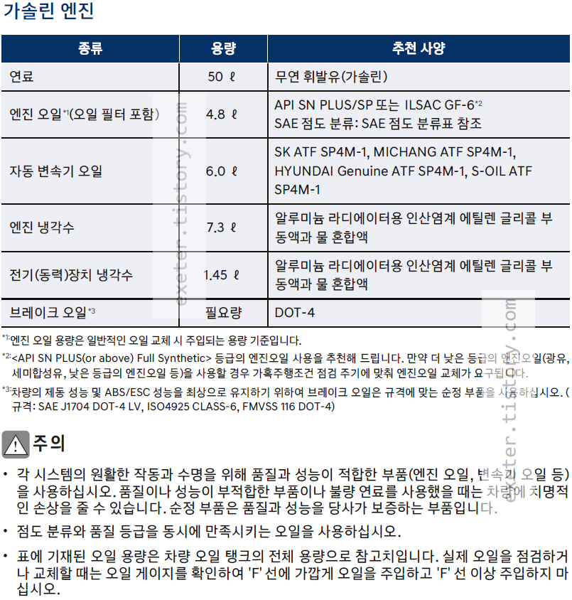 - 엔진 오일*1: 4.8 리터 (API SN PLUS/SP, ILSAC GF-6 *2)