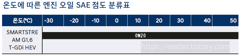 아래는 2023 그랜저GN7 HEV 매뉴얼에서 발췌한 '온도에 따른 엔진 오일 SAE 점도 분류표'입니다.