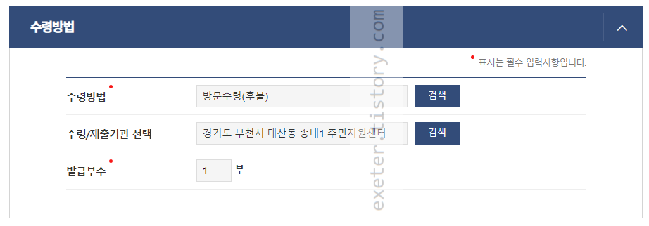 화면 하단에 [수령/제출기관] 선택란이 있어서 여기에서 수령지를 선택 할 수 있습니다.