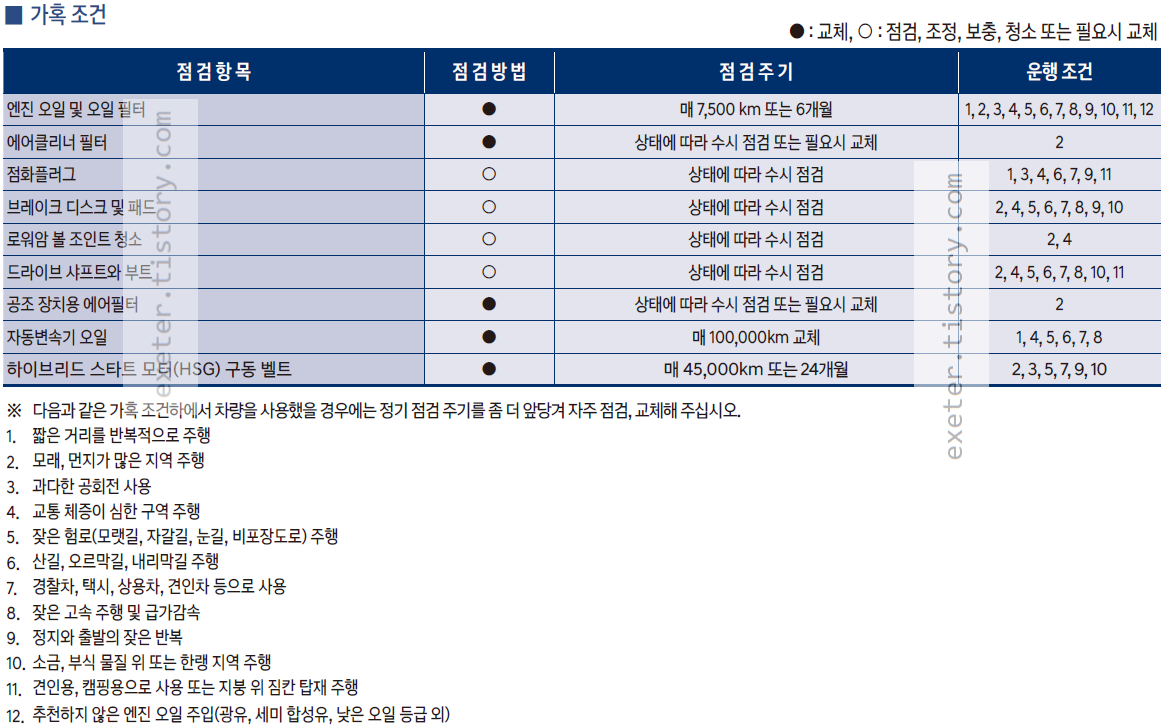차량 사용 설명서에서는 '가혹 조건'인 경우 교환/점검 주기를 빠르게 가져가도록 안내하고 있습니다.
