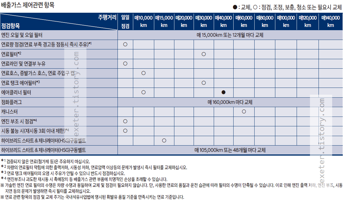 ※ 연료 관련 항목의 점검 및 교체 주기는 국내석유사업법에 명시된 휘발유 품질 기준을 만족시키는 연료 기준입니다.