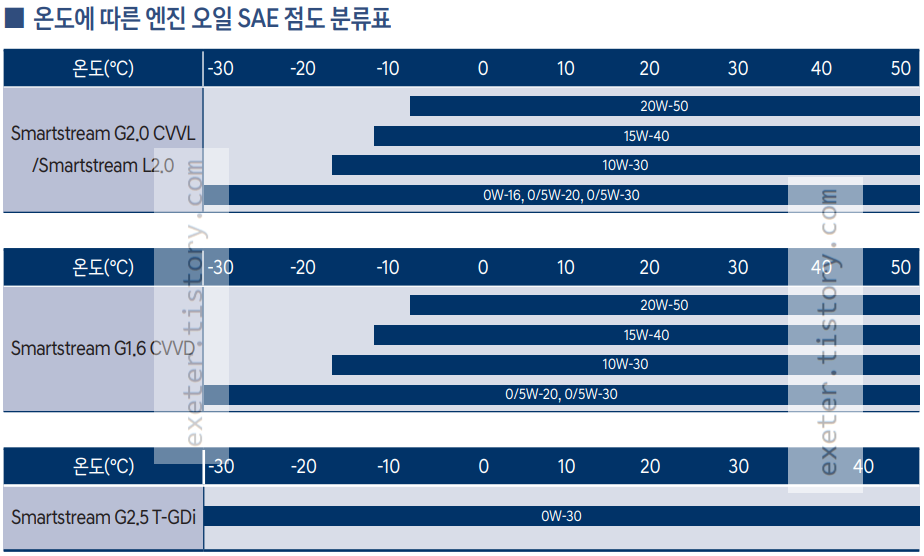 엔진 모델 별 '온도에 따른 엔진 오일 SAE 점도 분류표'는 아래 그림을 참조하세요.