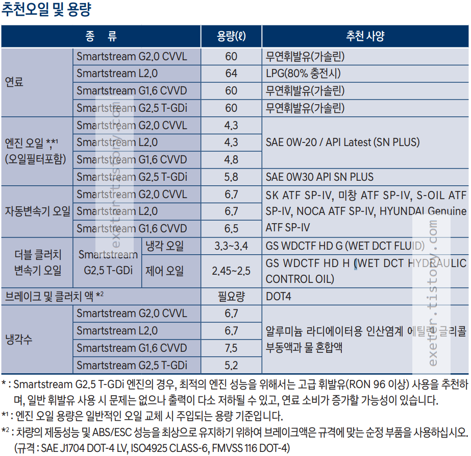 - 엔진 오일 (G2.0 CVVL): 4.3 리터 (SAE 0W-20 / API Latest (SN PLUS))