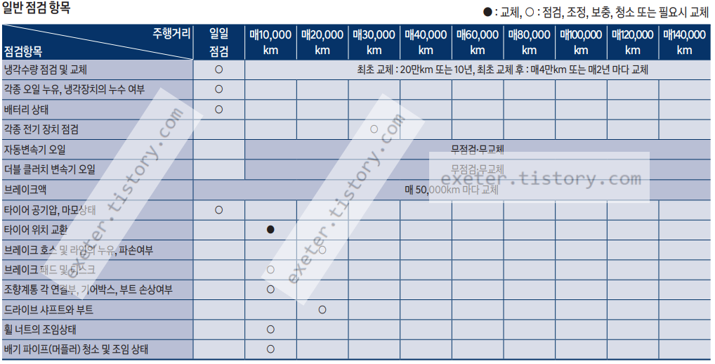 - 구동벨트(알터네이터, 워터펌프, 에어컨 벨트류) 장력, 마모 상태: 최초 90,000km 또는 72개월 점검, 이후 매 30,000km 또는 24개월 마다 점검