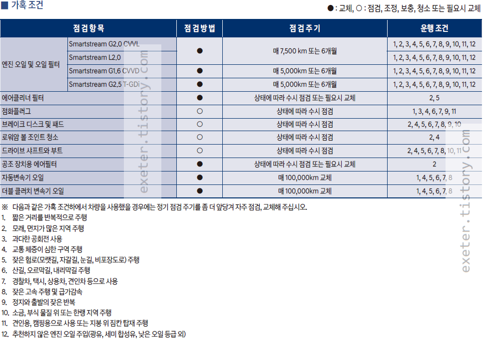 차량 사용 설명서에서는 '가혹 조건'인 경우 교환/점검 주기를 빠르게 가져가도록 안내하고 있습니다.