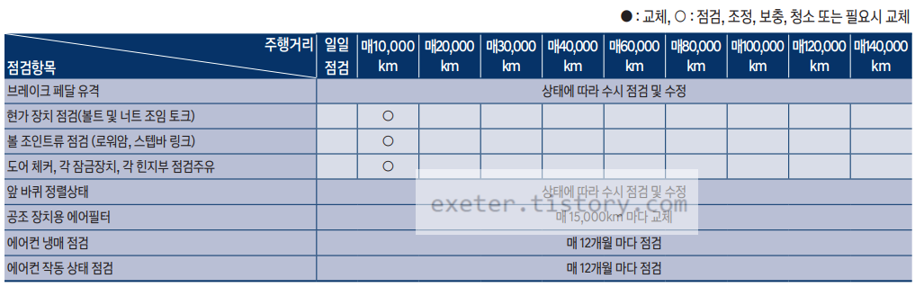 - 에어클리너 필터 점검/교환: 매 1만 km 점검, 4만 km 교환