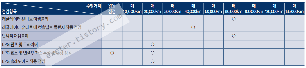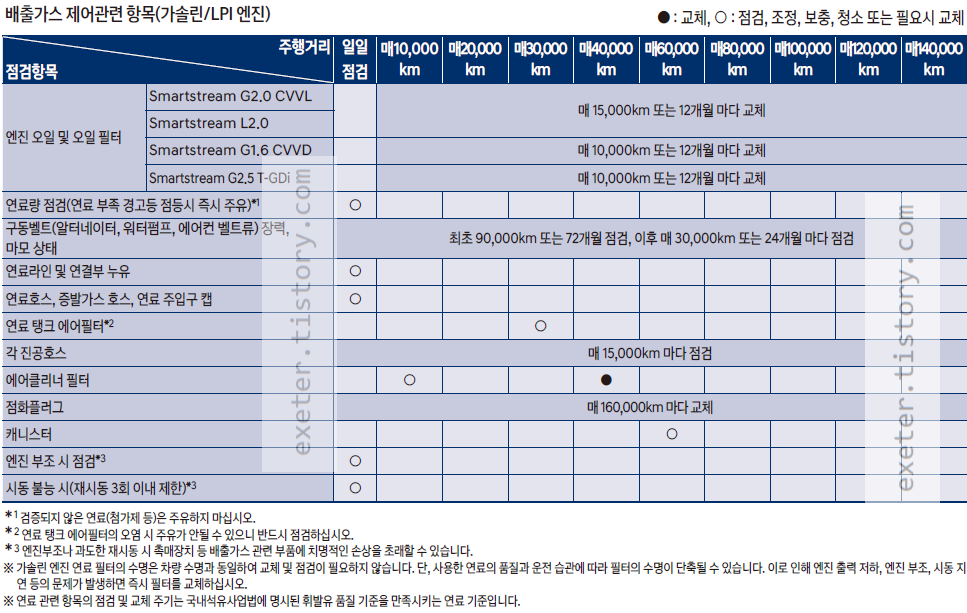 ※ 연료 관련 항목의 점검 및 교체 주기는 국내석유사업법에 명시된 휘발유 품질 기준을 만족시키는 연료 기준입니다.