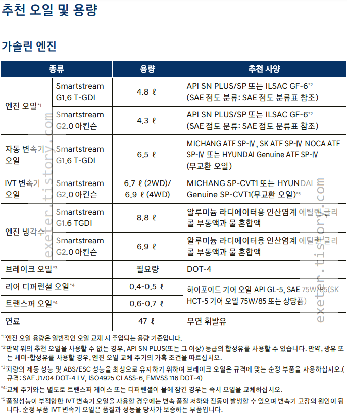 - 엔진 오일(스마트스트림 G2.0 아킨슨): 4.3 리터 (상동)