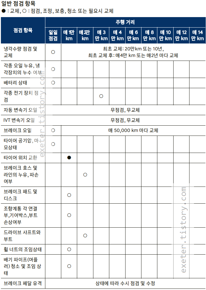 - 에어클리너 필터 점검/교환: 매 1만 km 점검, 4만 km 교환