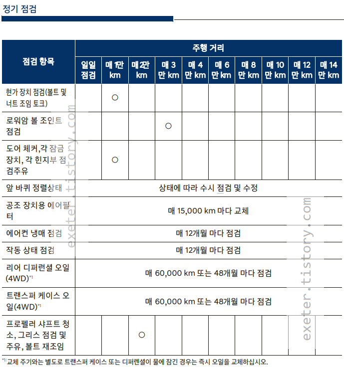 리어 디퍼런셜 오일 (4WD)*1 : 매 60,000 km 또는 48개월 마다 점검