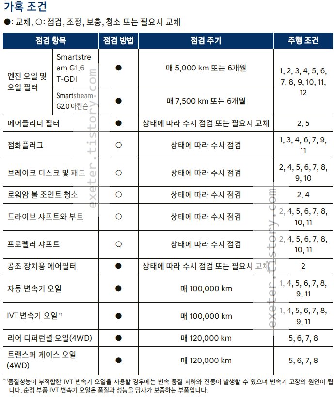 차량 사용 설명서에서는 '가혹 조건'인 경우 교환/점검 주기를 빠르게 가져가도록 안내하고 있습니다.