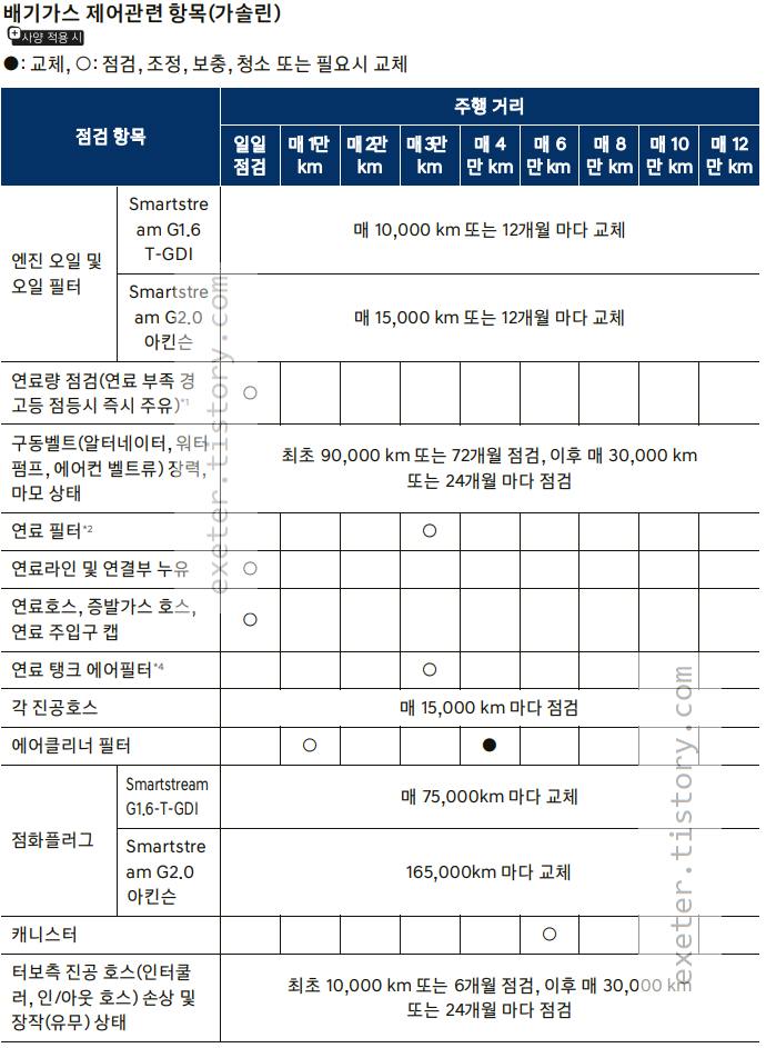 - 엔진 오일 및 오일필터 (G1.6 T-GDI): 매 10,000km 또는 12개월 마다 교체