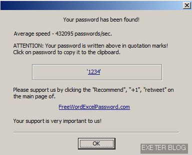 암호의 길이나, 복잡도에 따라 암호를 찾기 소요시간이 다른데, 예를들어 4 글자로 설정된 암호의 경우 1분내로 찾아냅니다. 복구된 암호는 화면에 바로 보여줍니다.