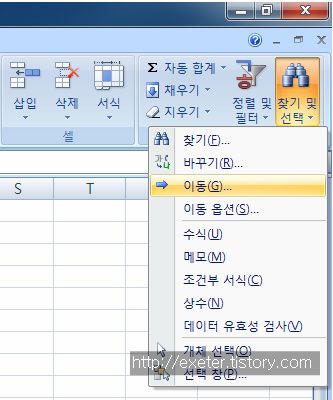 2. [홈] 메뉴 - [찾기 및 선택] 메뉴에서 '이동(G)' 를 클릭합니다. (또는 키보드에서 Ctrl + G)