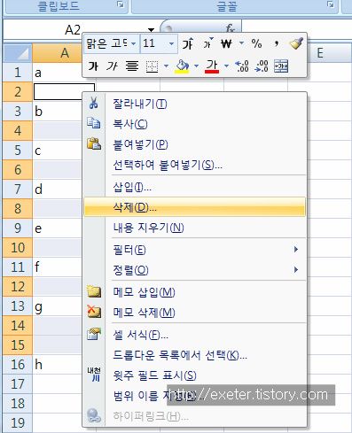 5. 선택된 빈셀 위에서 마우스 오른쪽 클릭 '삭제' 선택, 삭제 옵션(ex ; 셀을 위로 밀기) 선택.