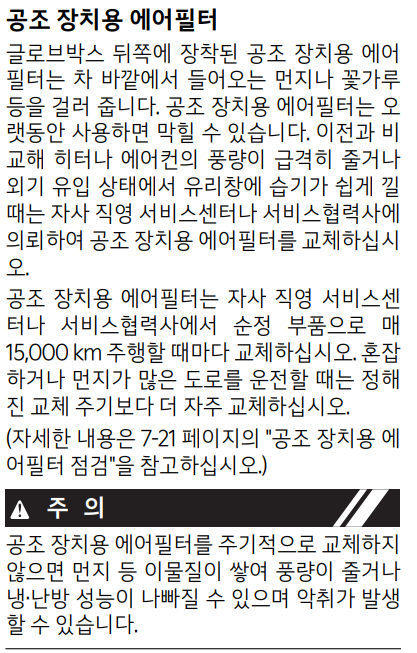 이전과 비교해 히터나 에어컨의 풍량이 급격히 줄거나 외기 유입 상태에서 유리창에 습기가 쉽게 낄 때는 자사 직영 서비스센터나 서비스협력사에 의뢰하여 공조 장치용 에어필터를 교체하십시오. 공조장치용 에어필터는 자사 직영 서비스센터나 서비스협력사에서 순정 부품으로 매 15,000 km 주행할 때마다 교체하십시오. 혼잡하거나 먼지가 많은 도로를 운전할 때는 정해진 교체 주기보다 더 자주 교체하십시오.