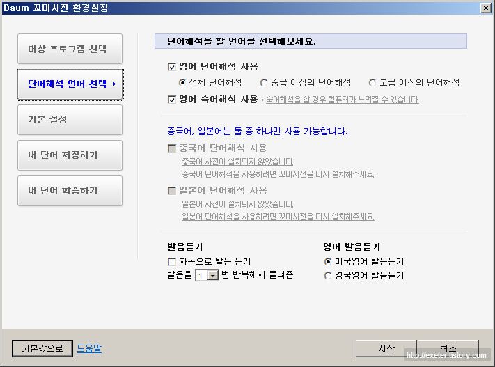 2) 단어해석 언어 선택 - 단어해석 기능을 사용하고자 하는 언어를 선택합니다.