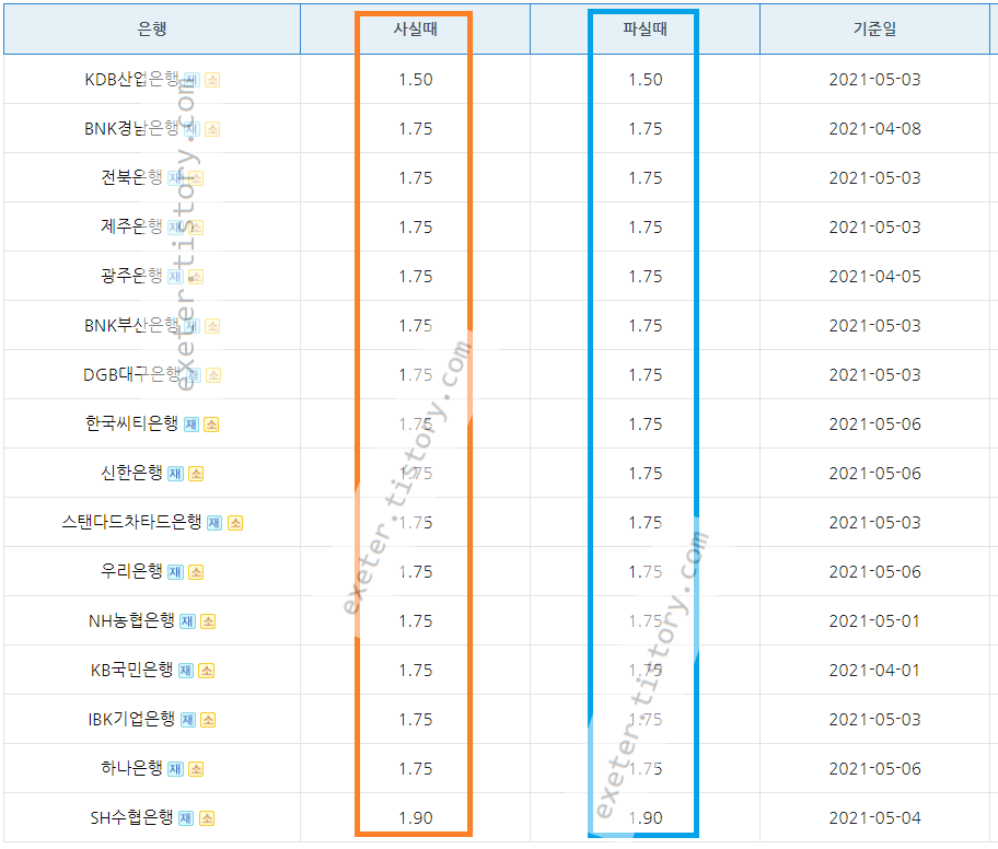 2021년 5월 기준, 미국 달러(USD) 환전 수수료율 비교입니다.