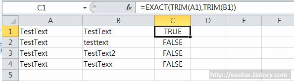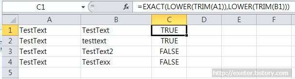 위에서는 단순히 EXACT() 만 사용한 것이 아니라, 문자열 양쪽 공백을 제거하기위해 TRIM() 함수도 함께 사용했습니다. 단, EXACT() 함수는 대소문자를 서로 다른 것으로 구분하기 때문에 2번째 행(row)에서 FALSE를 출력합니다.