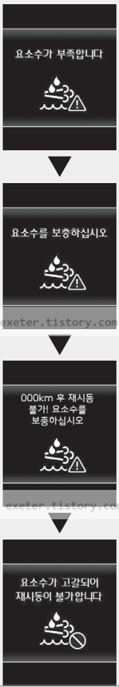 “요소수가 부족합니다”, “요소수를 보충하십시 오” 경고문이 표시되면 요소수를 충분히 보충하 십시오.