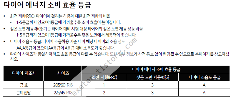 상세 타이어 규격 및 효율 등급/노면 제동력은 아래 사진을 참고하세요.