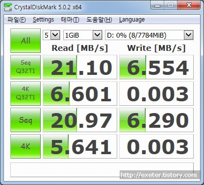 특히 4K Write 속도가 굉장히 느립니다. 위 PNY USB 3.0 벤치마크 결과와 약 160배의 수치 차이가 납니다.